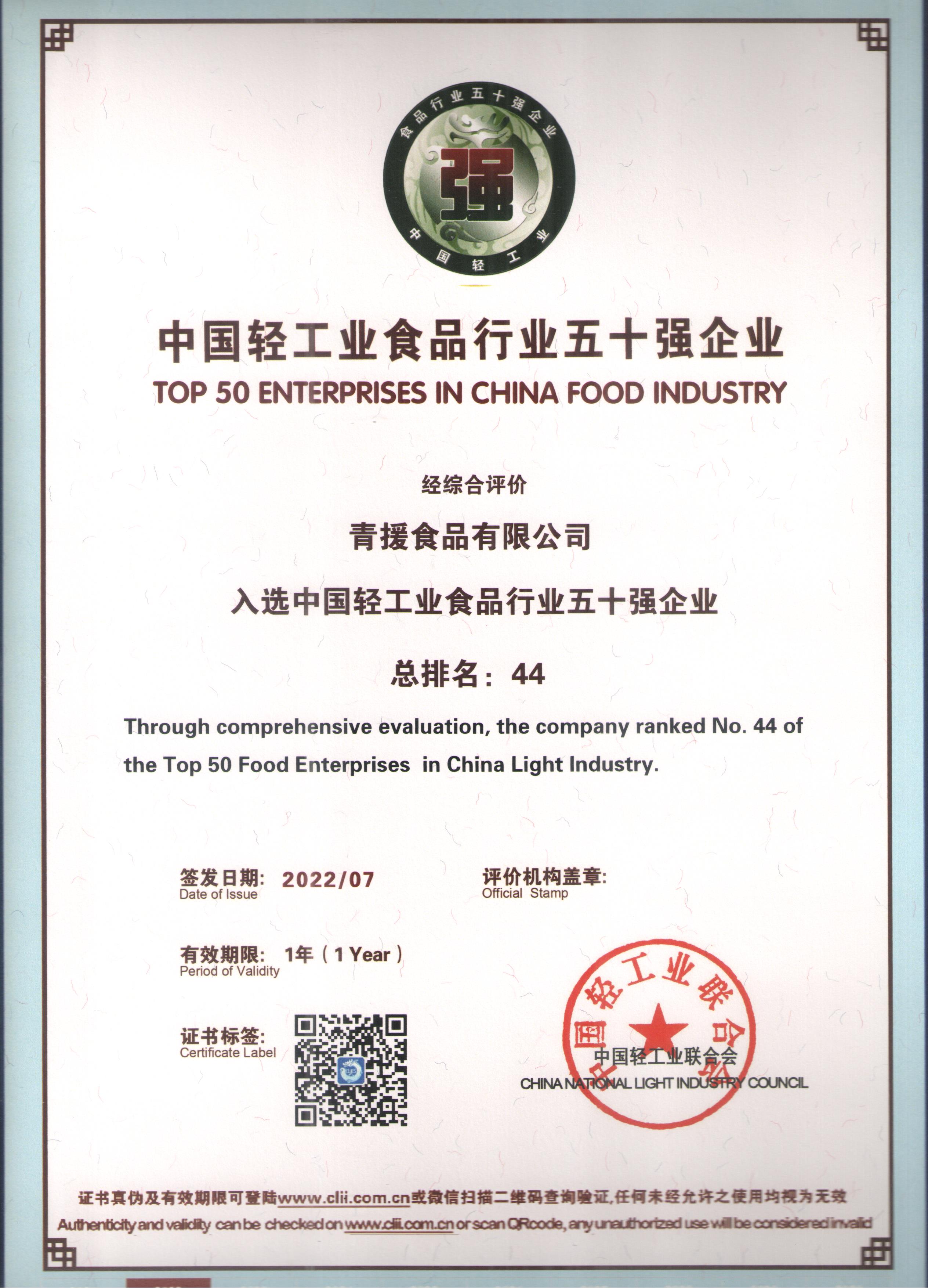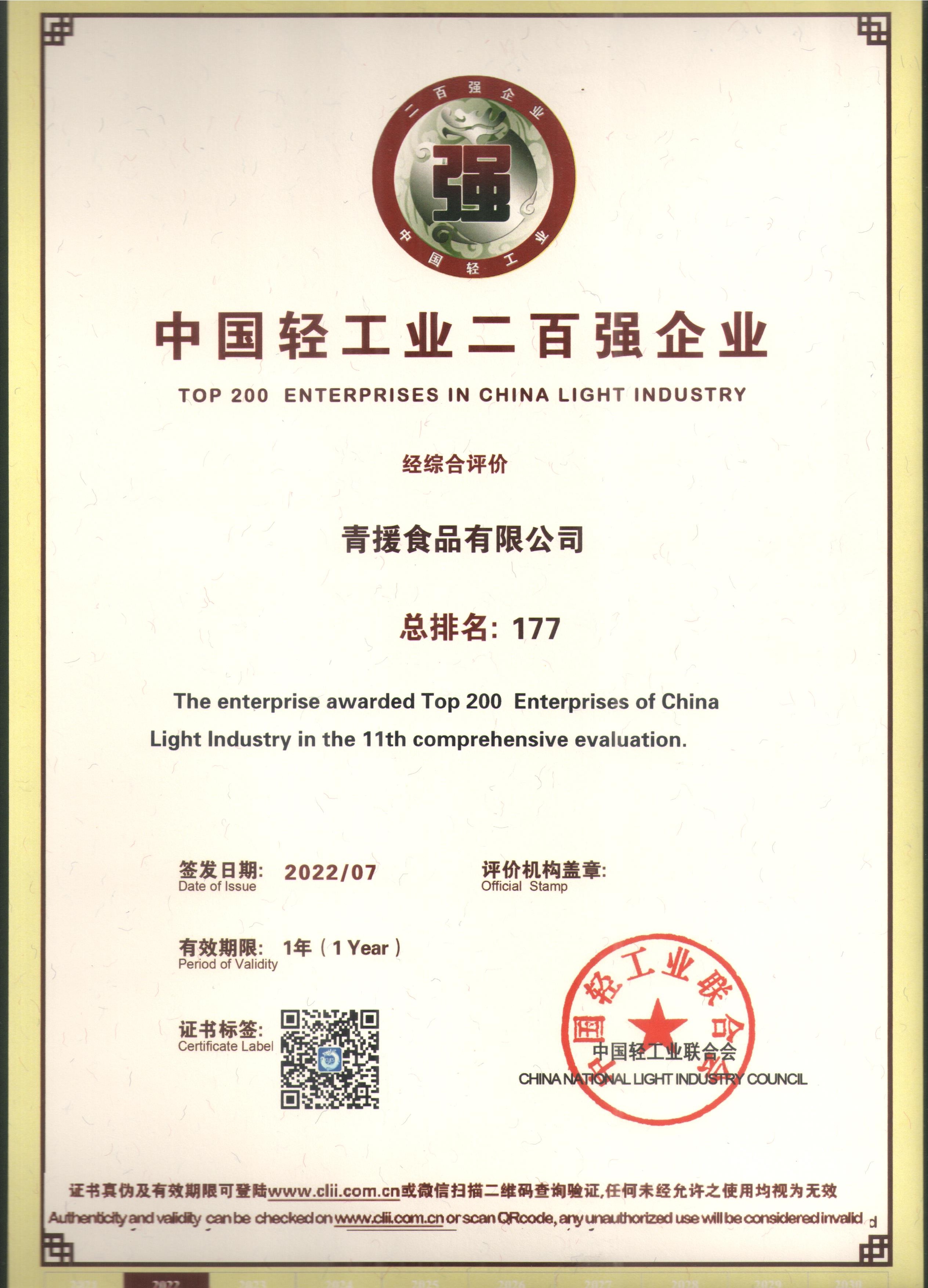 論壇發(fā)布了2021年度中國輕工業(yè)二百強(qiáng)企業(yè)、中國輕工業(yè)科技百強(qiáng)企業(yè)、食品五十強(qiáng)企業(yè)以及輕工裝備五十強(qiáng)企業(yè)名單,青援食品有限公司憑借良好的經(jīng)營優(yōu)勢(shì)及品牌獲得“2021年度中國輕工業(yè)二百強(qiáng)企業(yè)”(位居全國輕工行業(yè)第177位)、“中國輕工業(yè)食品行業(yè)五十強(qiáng)企業(yè)”(位居全國輕工業(yè)食品行業(yè)第44位)兩項(xiàng)榮譽(yù)。獲此殊榮,既得益于公司全體員工的不懈努力,也是權(quán)威機(jī)構(gòu)對(duì)公司綜合運(yùn)營能力的肯定,彰顯了公司在行業(yè)內(nèi)的地位和重要影響力。